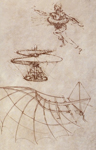 Da Vinci also explored the principles of machines. He created the ornithopter, a device with flapping wings that could in theory be attached to a human to achieve flight. His ornithopter was a kind of ancient hang glider. However, given the physical limitations of human endurance, da Vinci’s ornithopter was not practical. But like a good scientist, his failure propelled him to find out more and ask himself the question, “Why do birds fly?” Da Vinci observed, sketched and examined the flights of birds and created a scientific notebook on the subject, his “Codex on the Flight of Birds.” Remarkably, centuries before the concept of building a successful airplane was born, da Vinci conceived of human flight. Leonardo da Vinci may have lived a Renaissance life, but he strode in thought with the modern world.